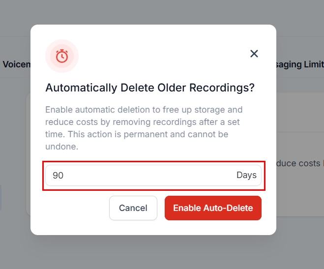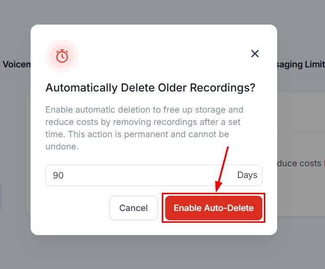 Confirm the action by clicking the Enable Auto-Delete button. Please note that once call recordings are deleted, they cannot be recovered.
