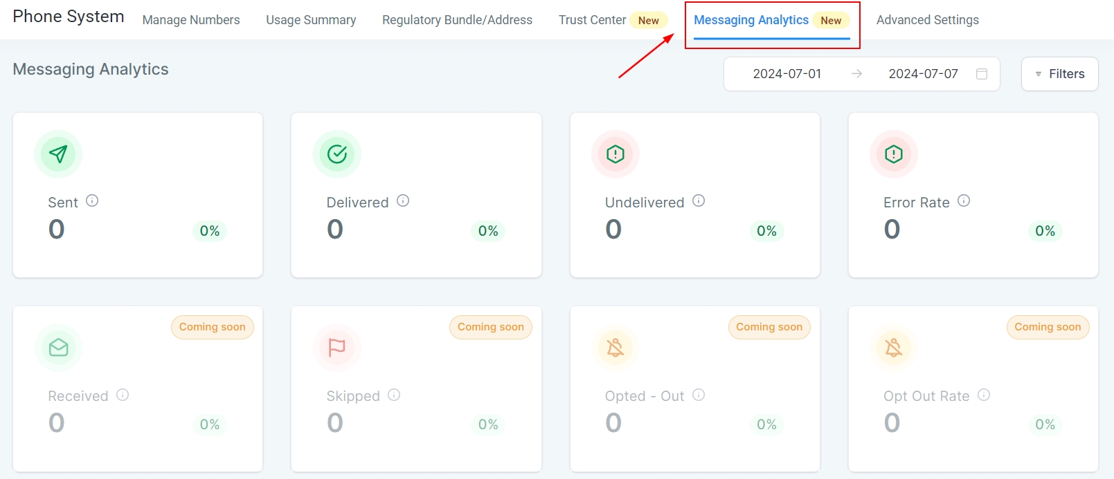 You have four metrics available as of right now, Sent, Delivered, Undelivered, and Error Rate. These will offer you the total number (1) and the percentage of the total amount of text messages sent or attempted that it constitutes.