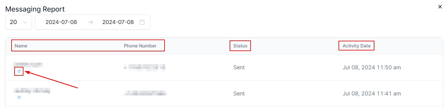You can access a detailed report for each status by clicking on it, this will show you the contact this was sent to, the status of the message, and the date of the activity. It also gives you quick access to their conversation page by clicking the blue icon.
