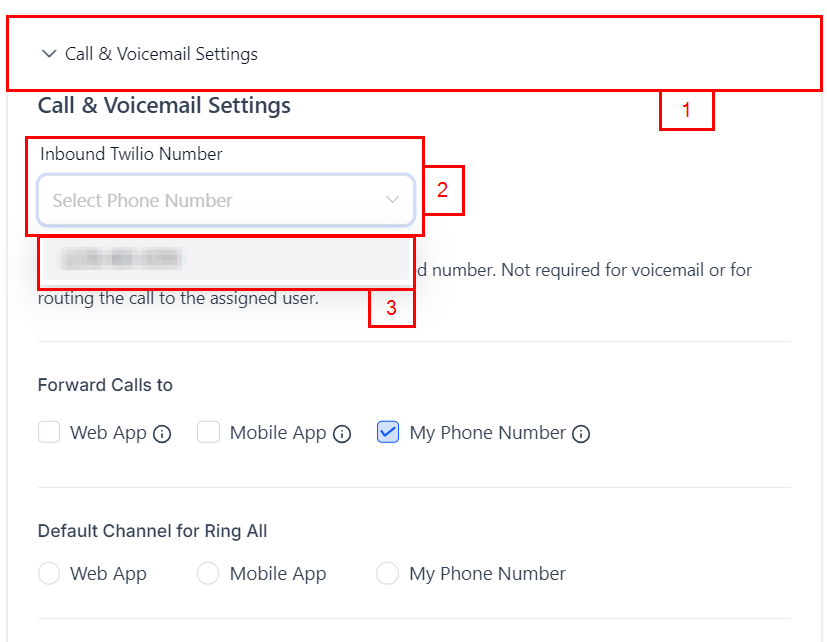 3. In the user's settings, locate the dropdown menu for phone numbers.