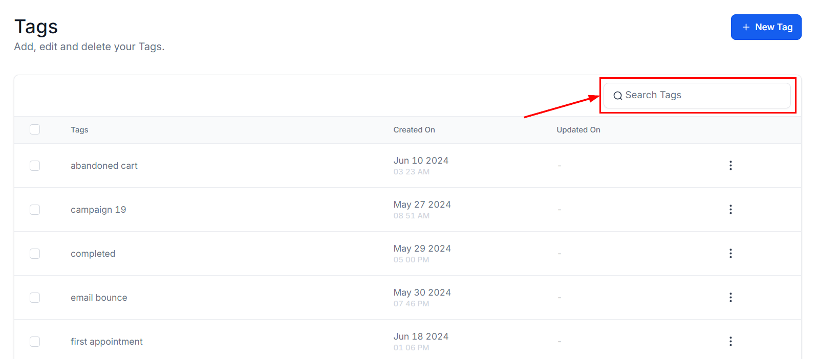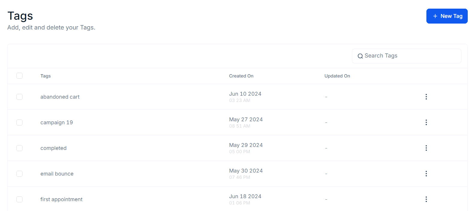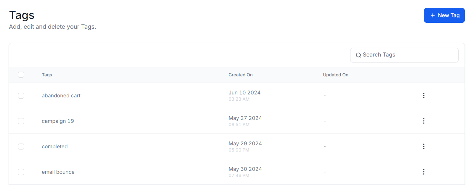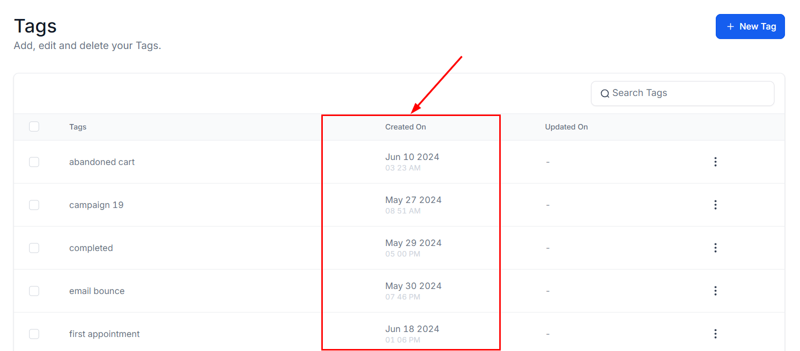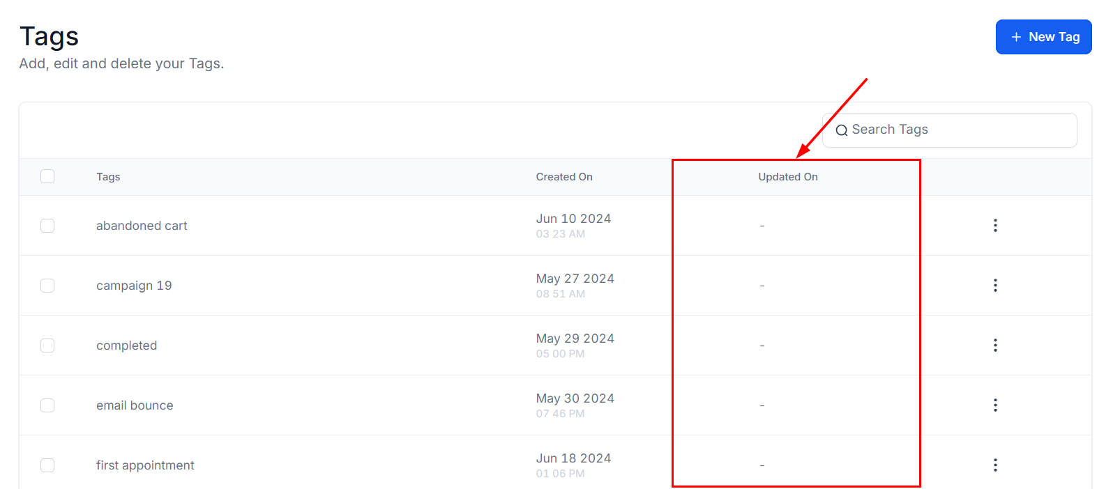 The Updated On column indicates the last time each tag was edited, displaying the precise date and time any changes were made. If no updates have been made to the tag, the column will display a β-β sign.