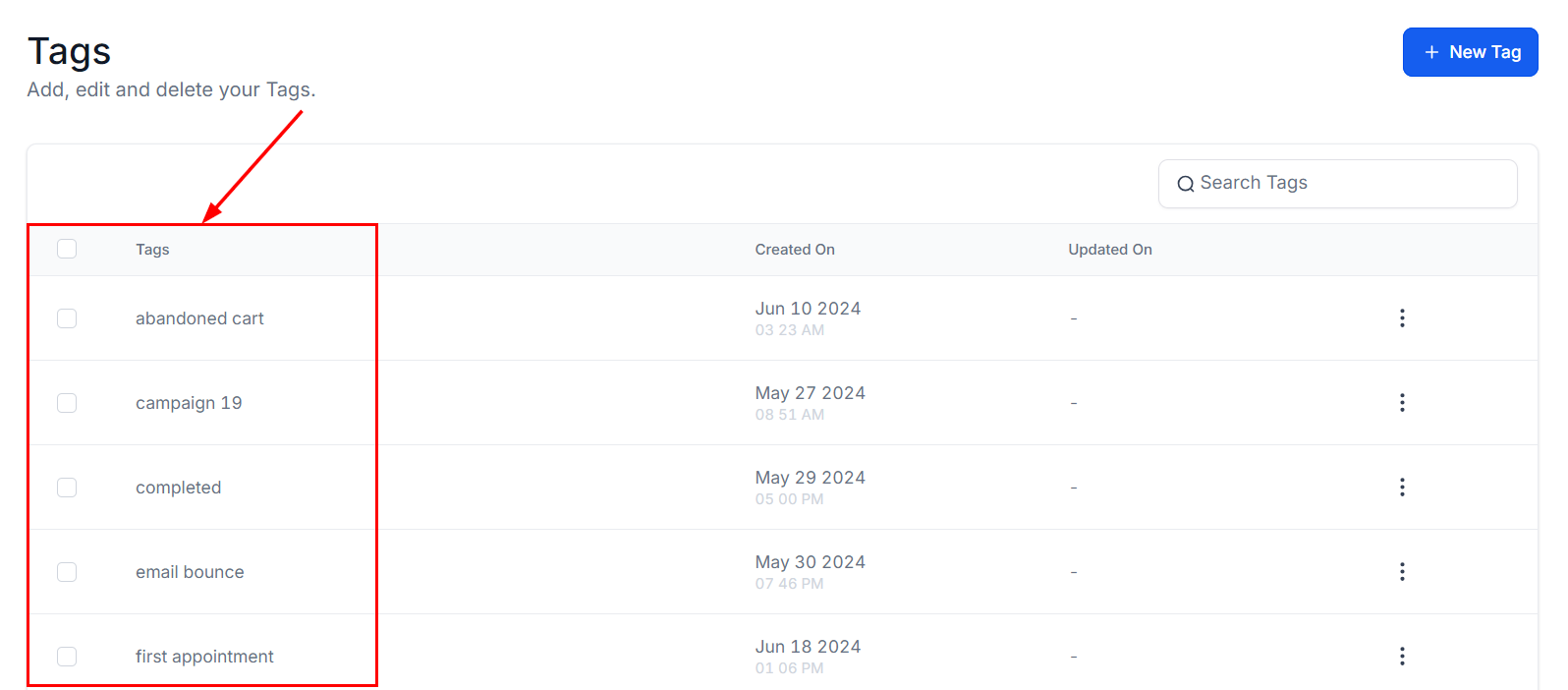 The Tags column provides a comprehensive view of every tag you have created. It displays all the names associated with your existing tags.