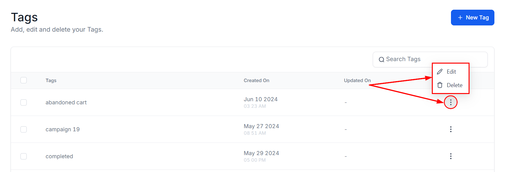 The three-dot menu on the far right of each tag entry allows you to edit or delete tags as needed.