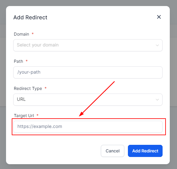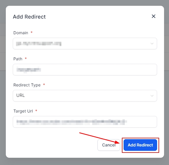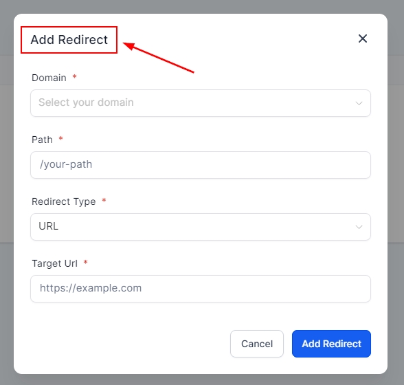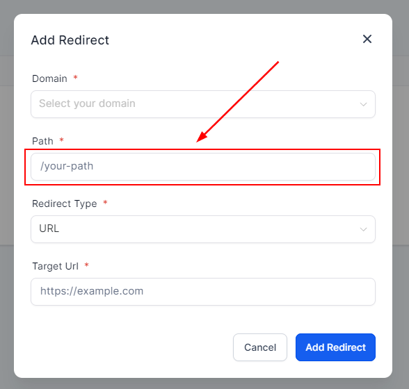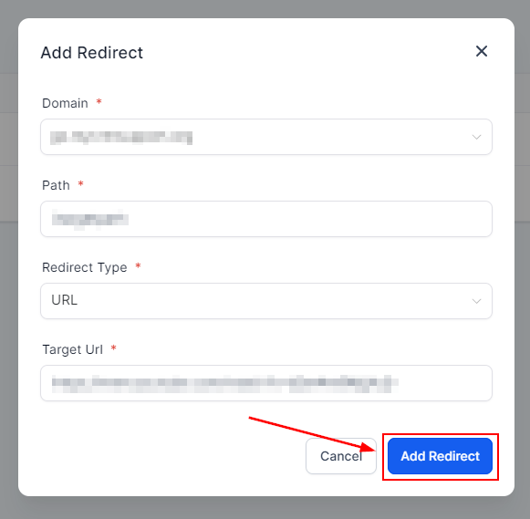 Go to your Settings and look for the URL Redirects section in your left-side menu, here click on Add Redirect. This button opens the "Add Redirect" pop-up where you can set up URL redirection.