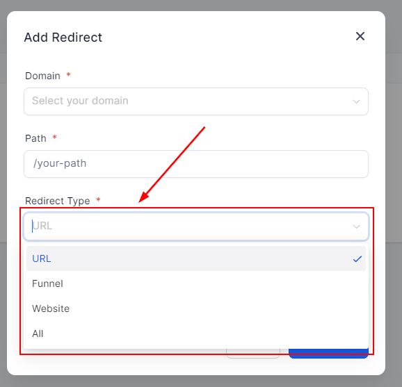 Here you can select the type of redirect such as Funnel, Website & URL.