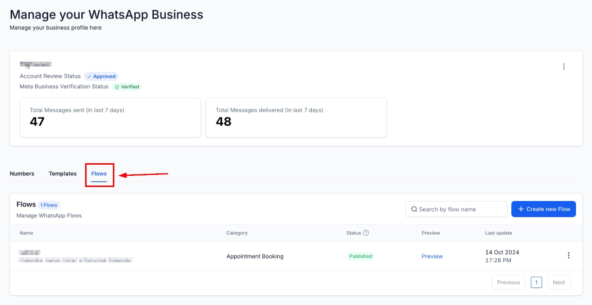 Navigate to the WhatsApp section inside your Sub-Account Settings and switch to the Flows tab.