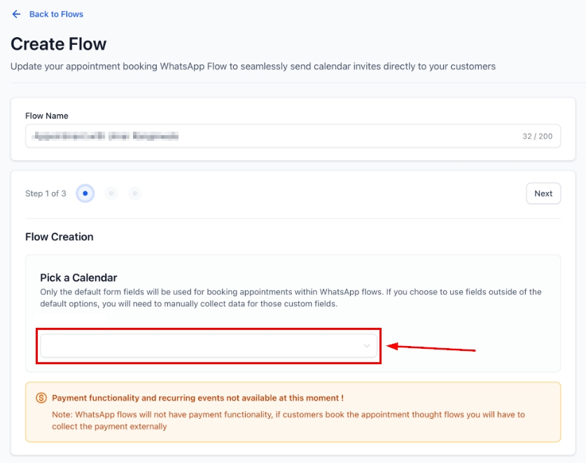 Create a new Flow or select your desired Flow from the ones you've created. Once inside the builder select the Calendar where you want the appointments to be booked then click next.