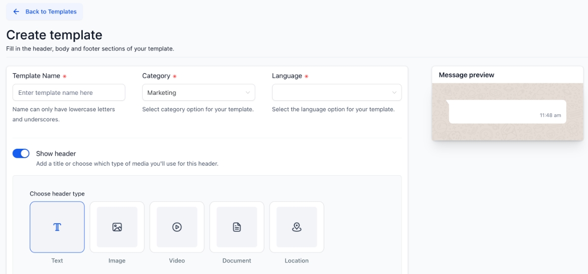 Inside the WhatsApp section select the templates tab and create a New Template.