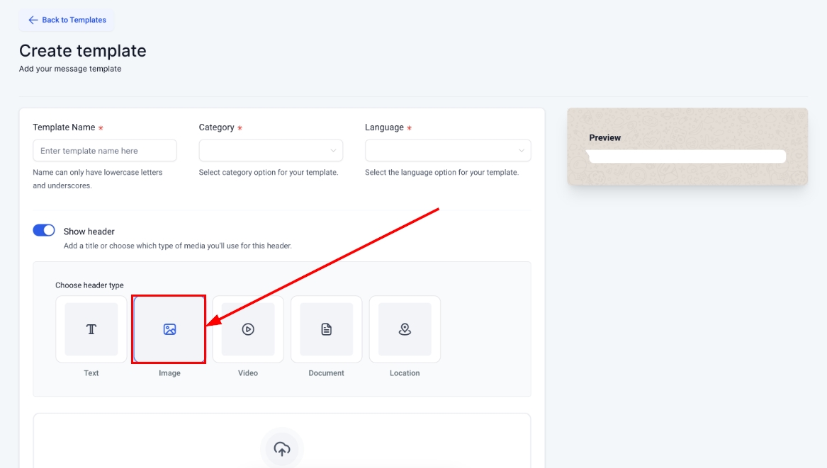 A new section will appear where you need to provide the Template Name, Category, Language, and Header information.