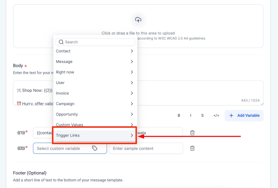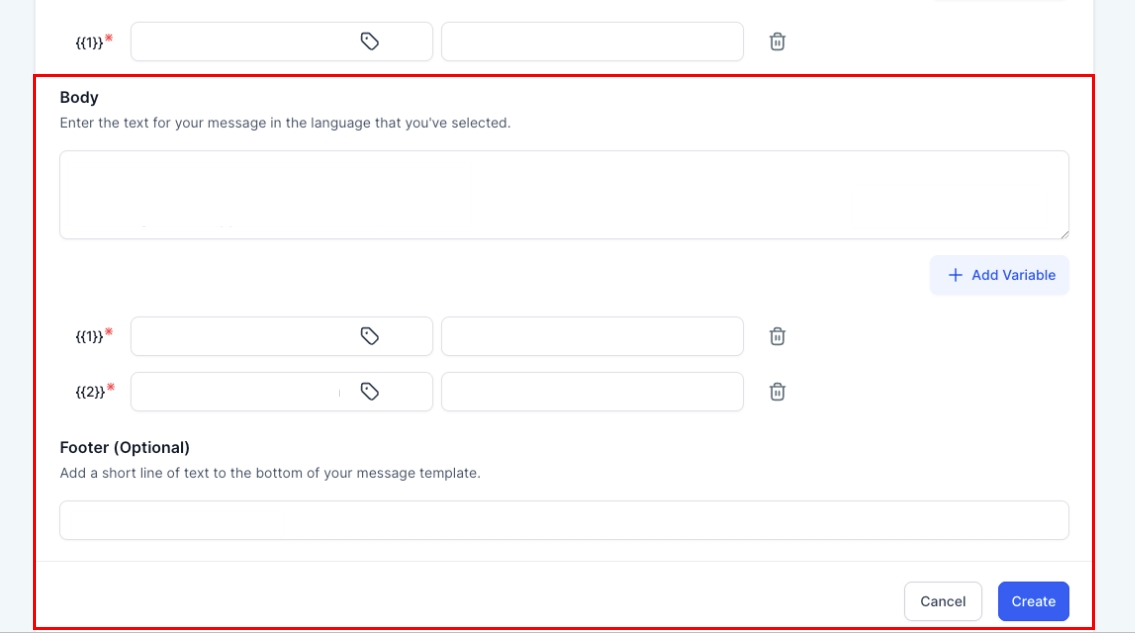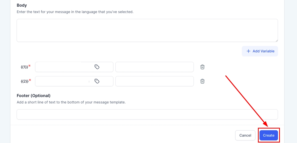 Footer (Optional): Add a static footer if needed. Note that you must provide sample values for all custom variables, as Meta requires examples when submitting the template.
