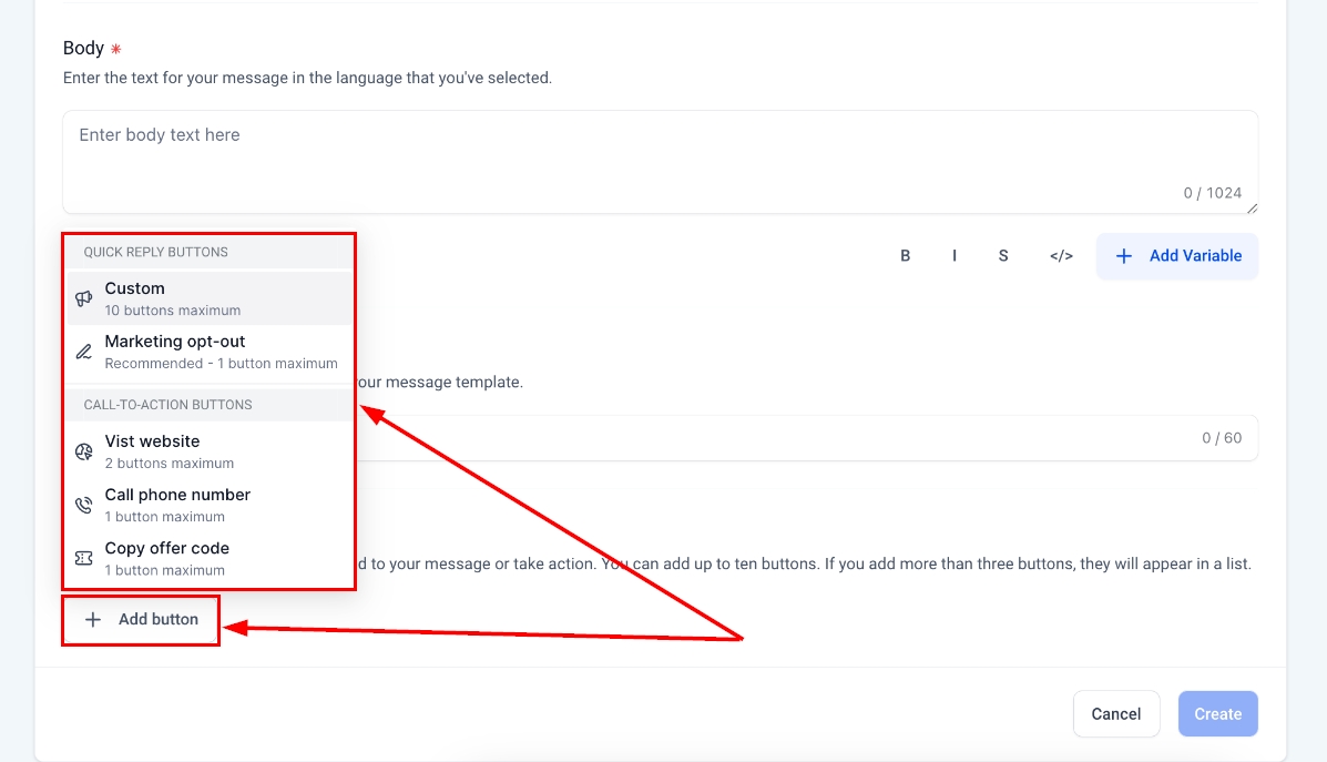 You can add Quick Reply, Visit Website, Personalized Website Link, Call Phone Number, Copy Offer Code, or Marketing Opt-Out buttons.