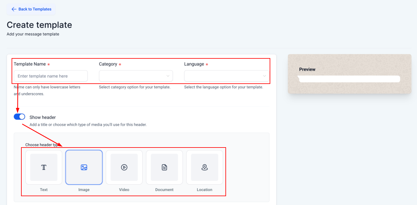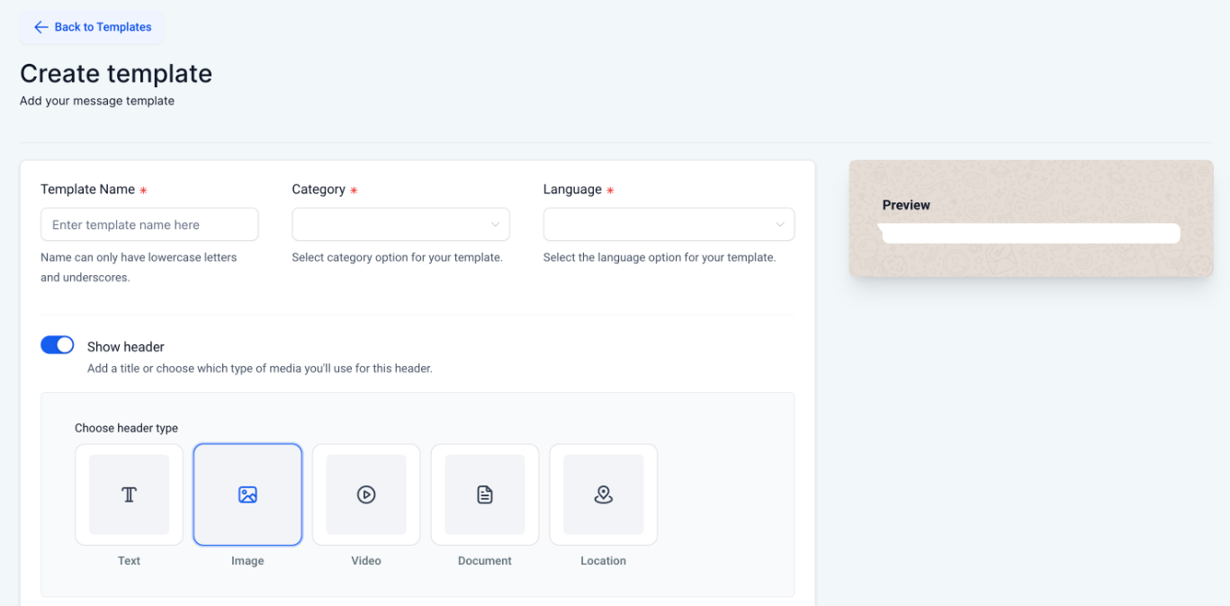 Add the Template Name, Category, and Language, this will be used by Meta when verifying the template. Enable the Header by toggling the option so your media is the beginning of the message. Once set, select the type of media you'll be using.