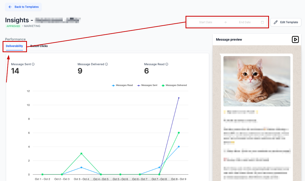This will show you the insights for the selected template, which are divided into Deliverability and Button Clicks.