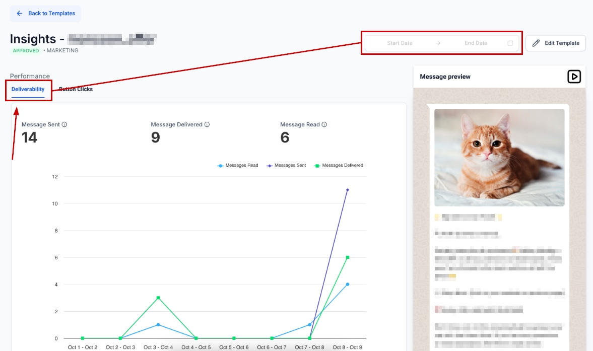 This will offer you data on the effectiveness of your template, including details on how many messages you've sent, how many have been delivered, and how many were opened. To access these metrics click on Deliverability then select Start Date and End Date