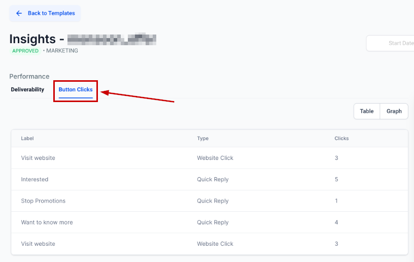 These let you analyze the performance of templates categorized as MARKETING or UTILITY based on the amount of interaction they receive. To access them click on Button Clicks.
