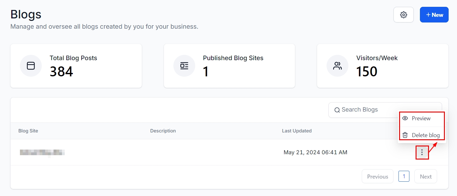 By clicking on the three dots under Action you can Preview or Delete the blog