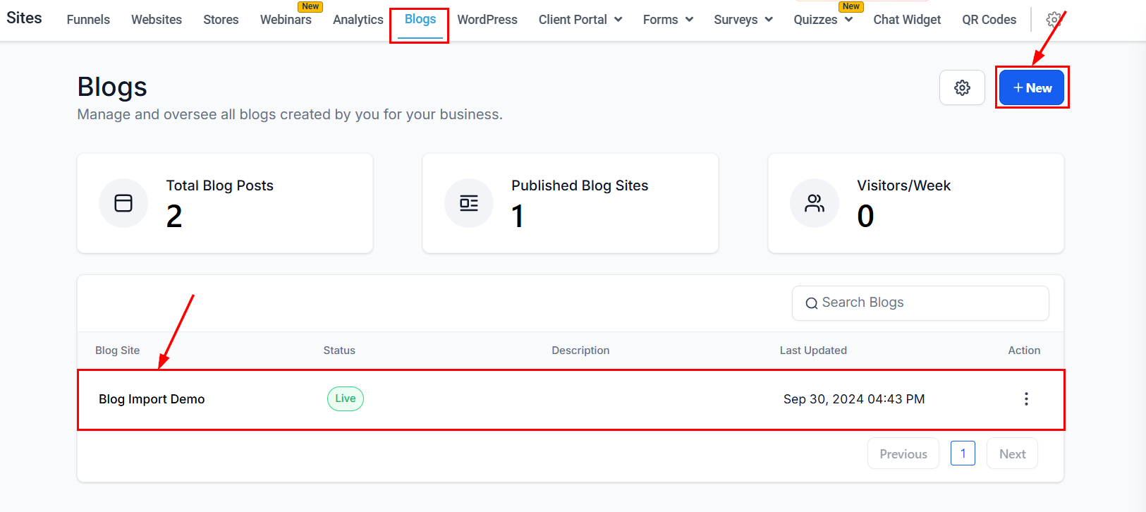 Navigate to Sites > Blogs and create a new Blog Site or access an existing Site by clicking its name in your Blog Site List.