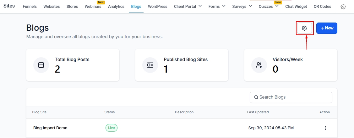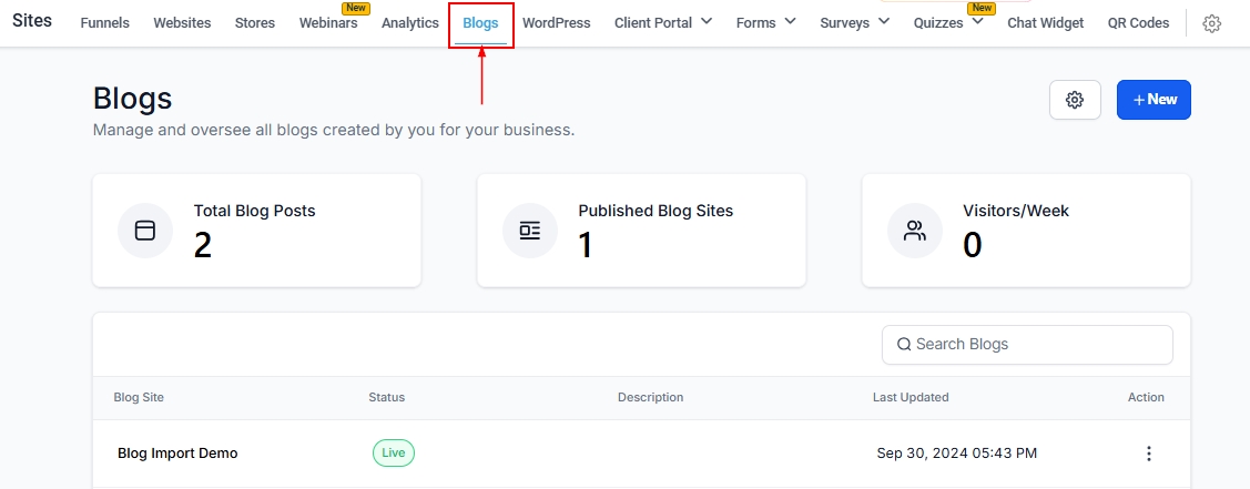Navigate to the Sites > Blogs. Here you can find the blogs in your CRM.