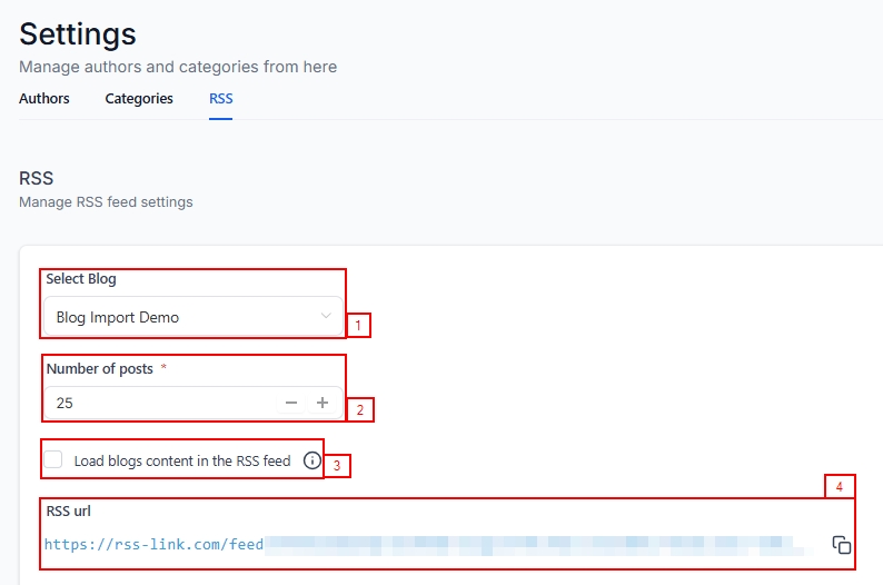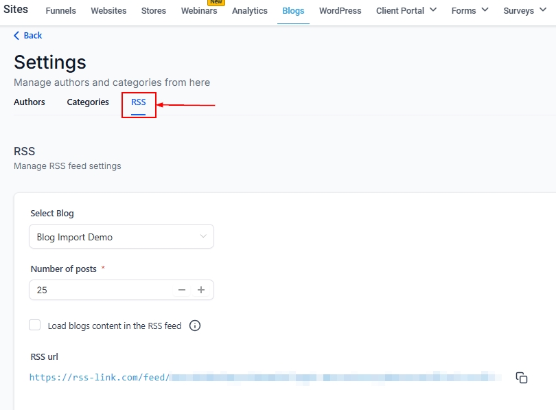 Click the "Load blog content in RSS feed" to add your blog content to the RSS feed. Your RSS feed is typically generated automatically once you save the settings. It will have a URL like https://rss-link.com/feed. You can use this URL to subscribe to your blog's RSS feed or share it with others.