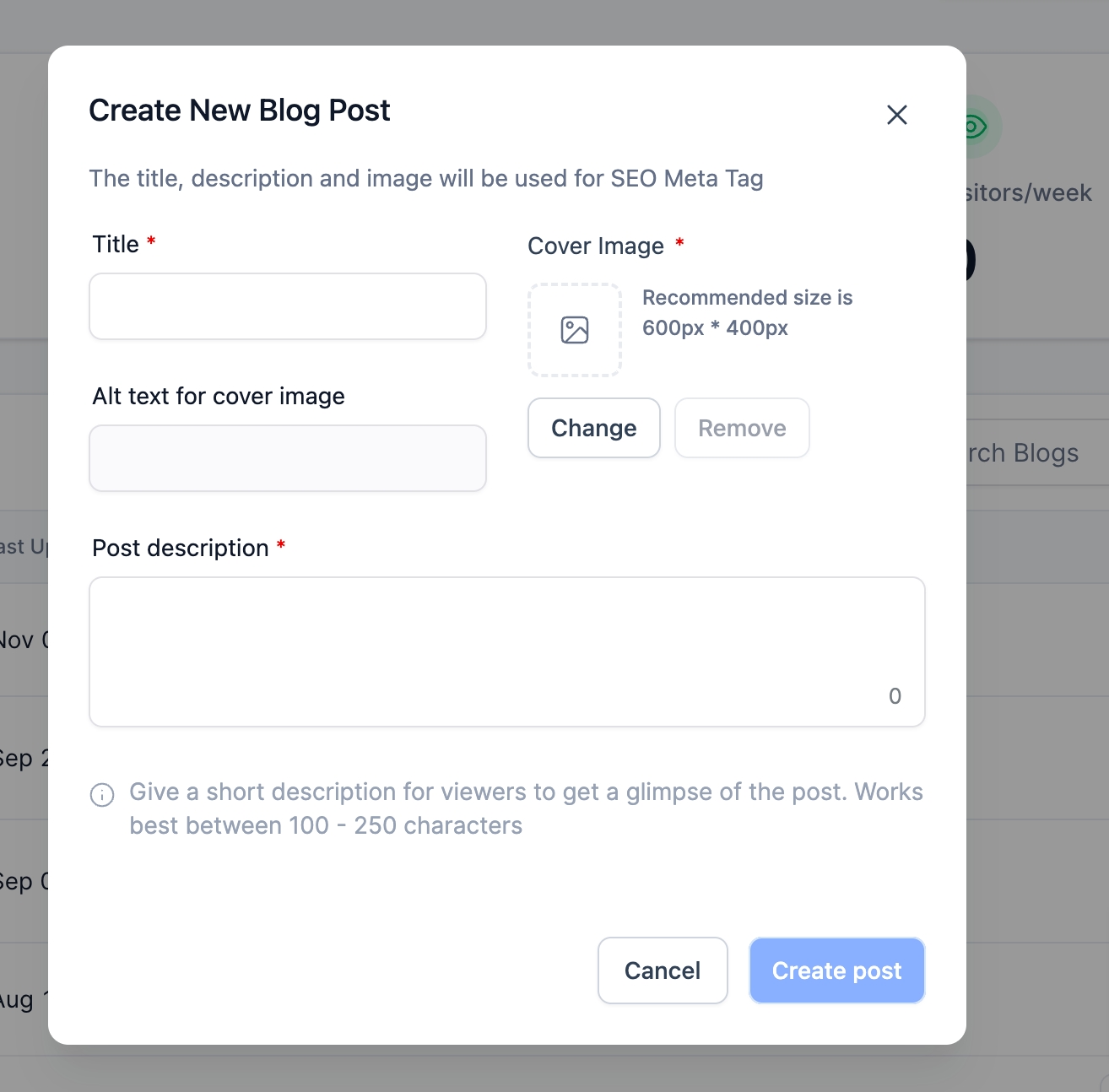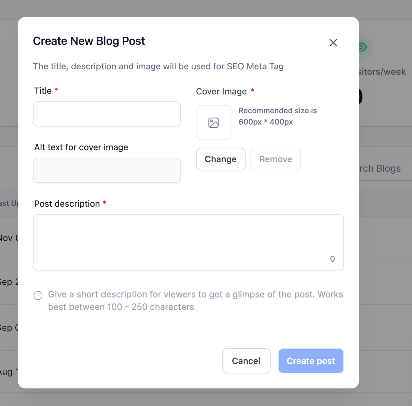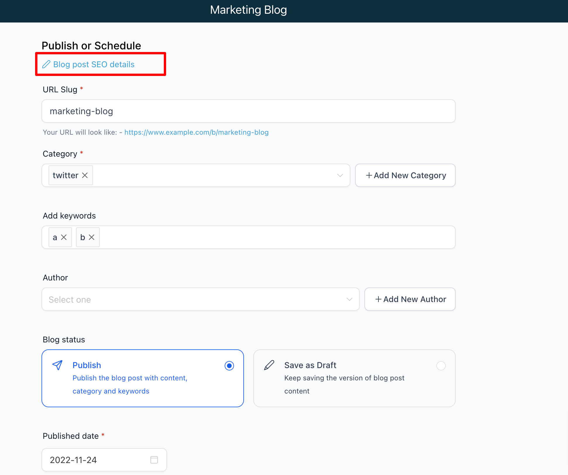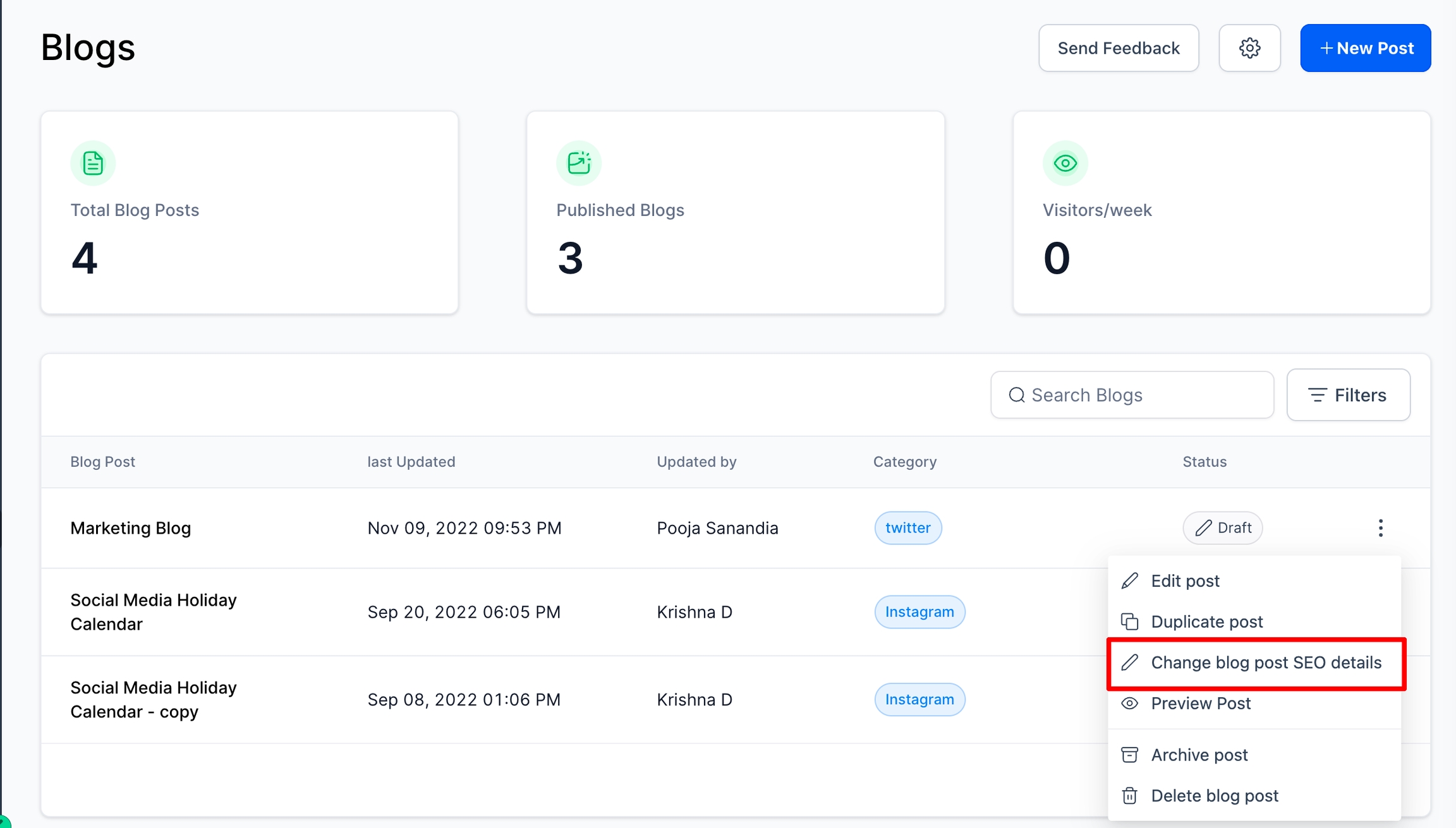 This option allows you to revisit and modify SEO details for existing blog posts: Click on the blog post you want to update.Choose "Update SEO Details" from the menu.Make necessary changes to the title, meta description, URL slug, and other SEO elements.Save your changes to apply the updated SEO details.