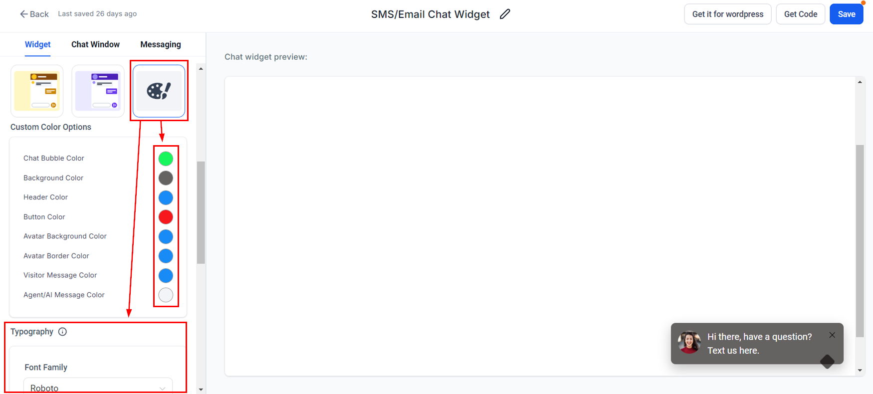 By clicking on the gray paint palette icon you can customize the colors and typography for each element of the chat widget.