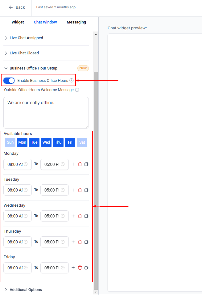 You can also add your Business Office Hours to Live Chat. By Enabling Business office Hours and adding your business' available hours.