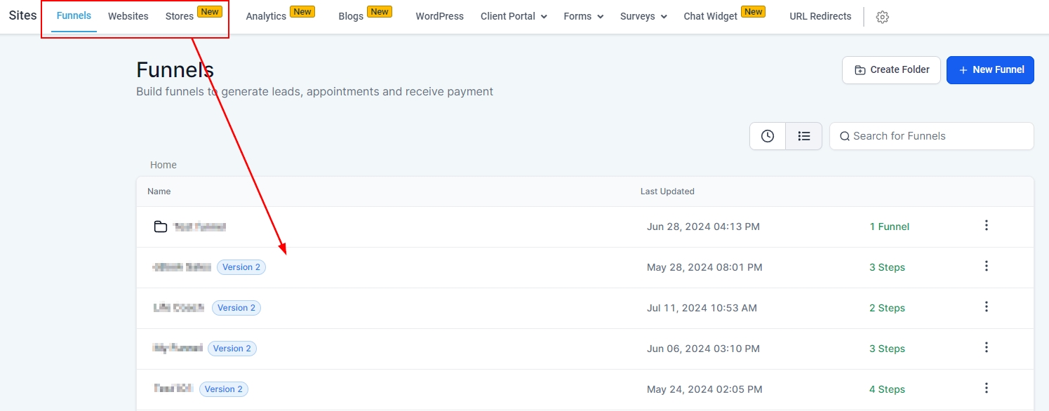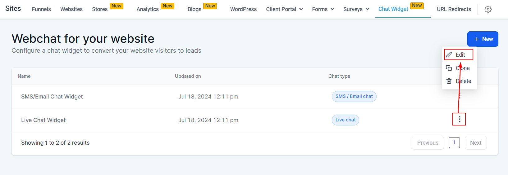 If you created your Website inside your CRM or you want to add a widget to a Funnel, first access that Website/Funnel inside of your sites.
