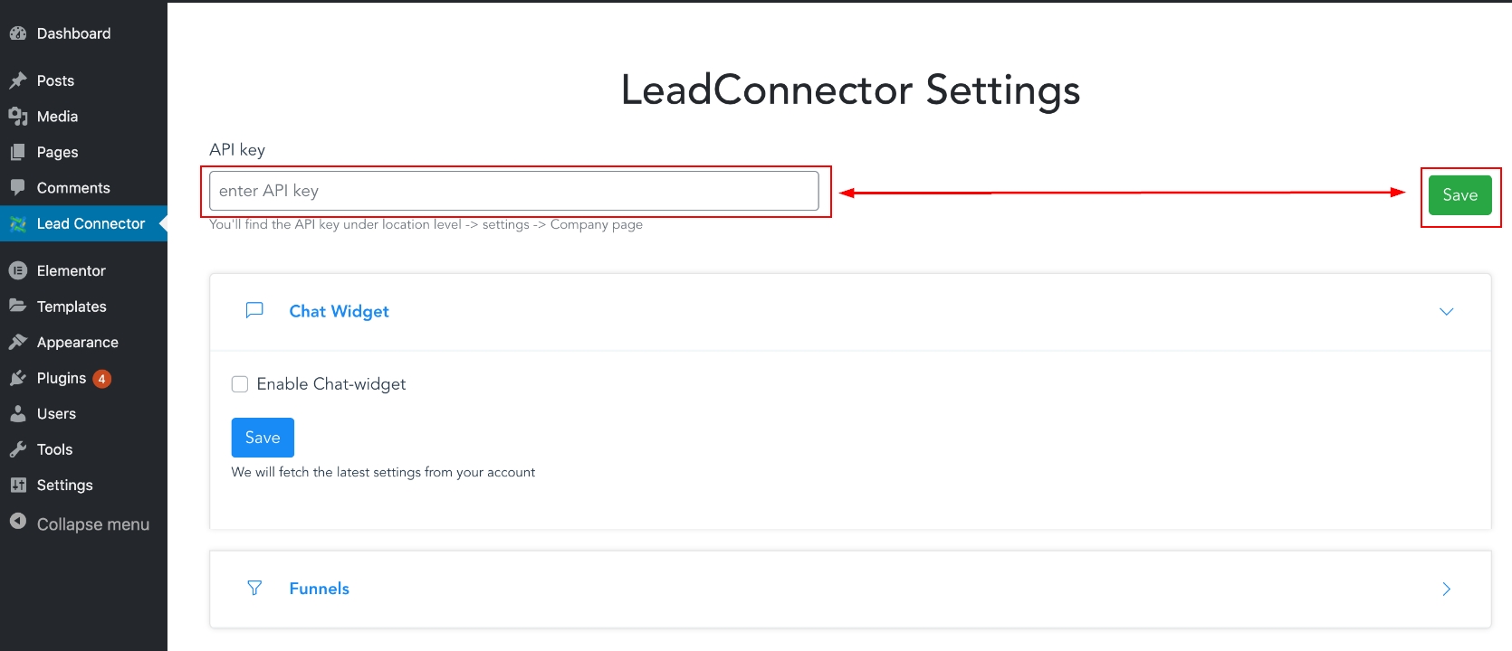 Head back to your WordPress and access LeadConnector on the left side Menu.