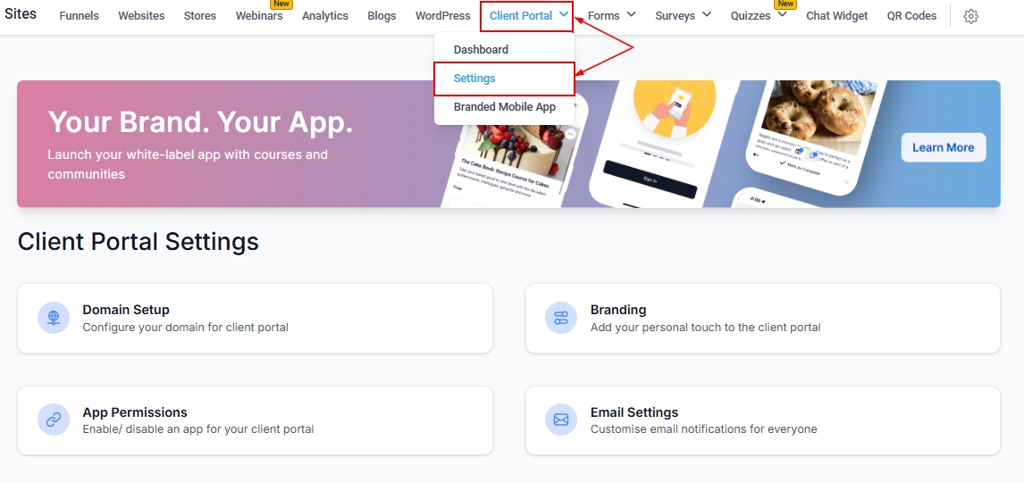 Navigate to Sites → Client Portal → Settings from your account Dashboard.