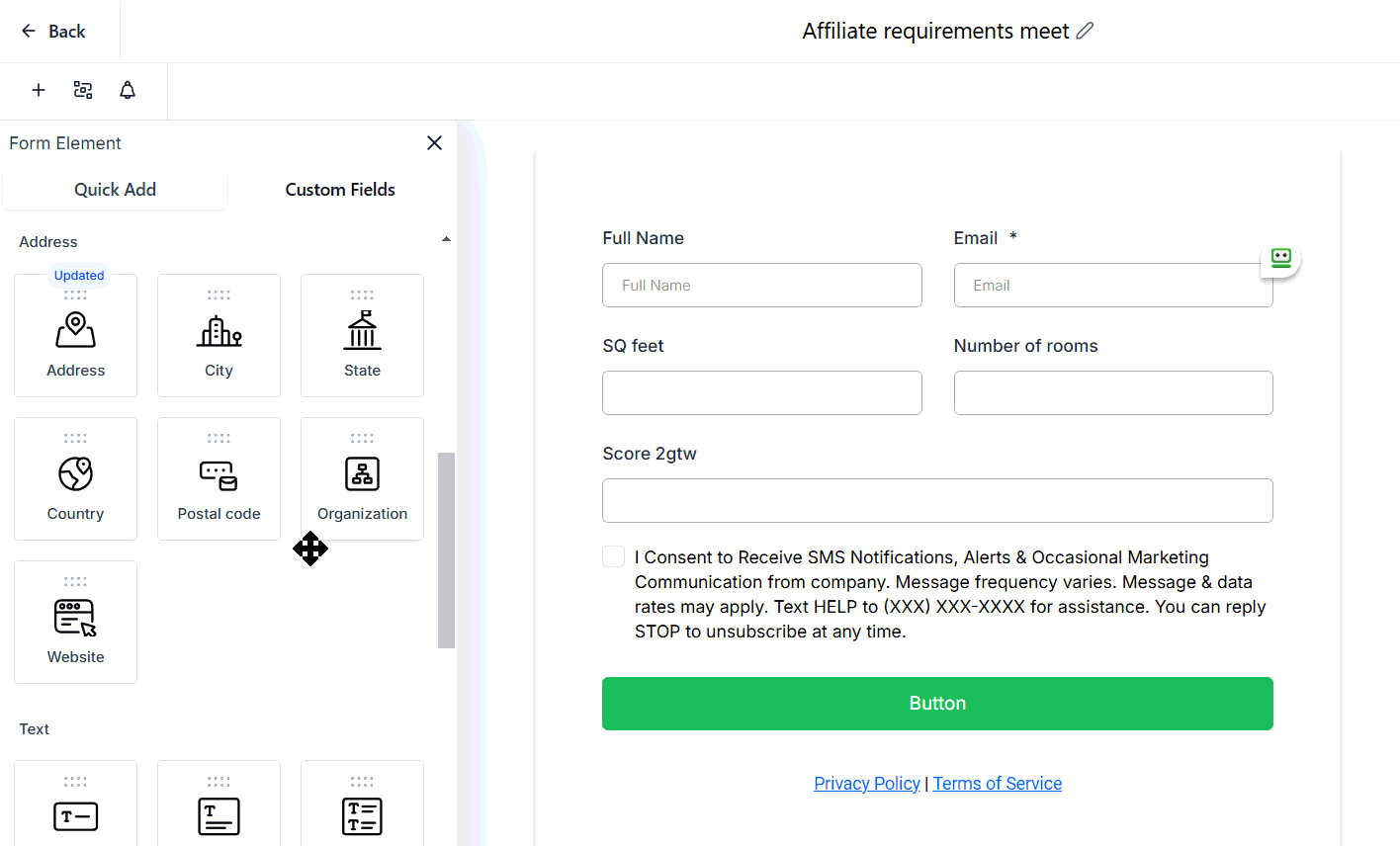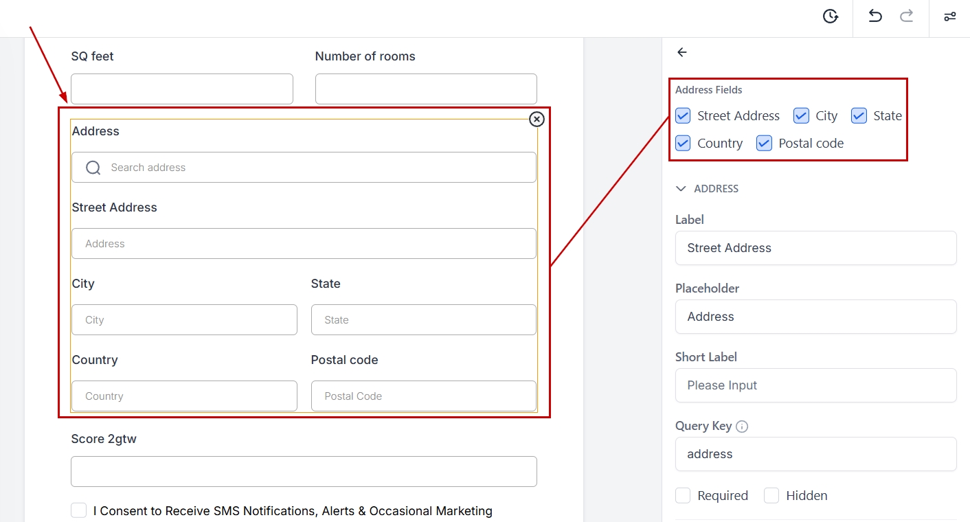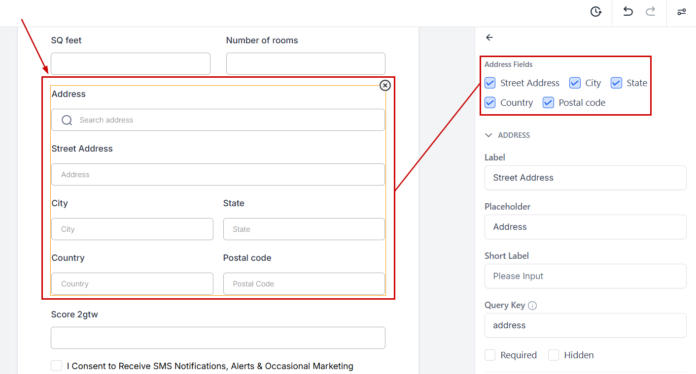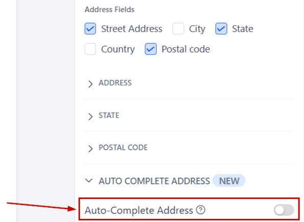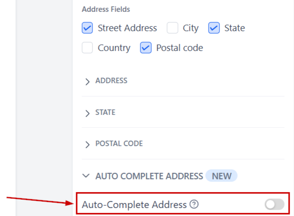 This field has two modes, Auto-complete and manual input. The Auto-Complete Address element integrates Google Places for address suggestions and details, providing a quick and easy way to add contact addresses. However, if you prefer manual input scroll down to the Auto-Complete Address and toggle the option off.