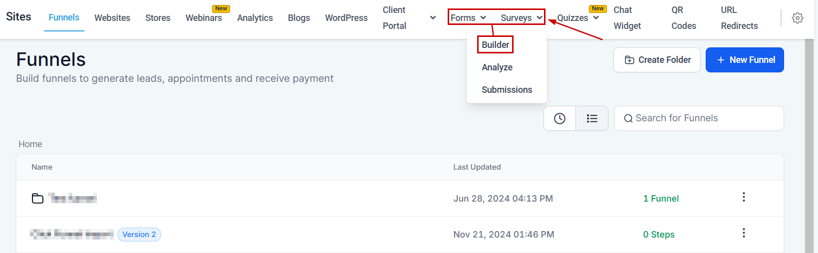 To access the builder, navigate to the Forms/Survey tab inside the Sites section and create or edit a document.