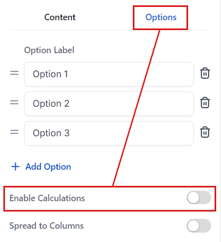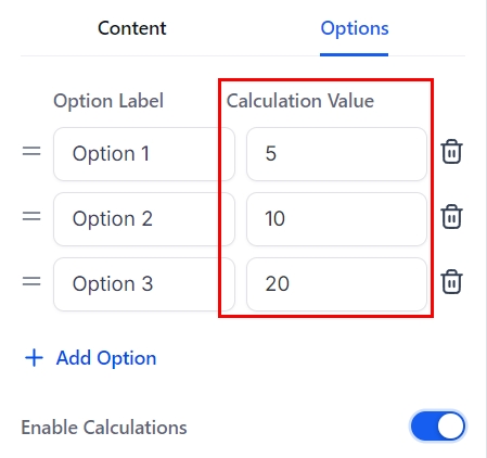 Click on the added element and go to the Options section where you’ll toggle Enable Calculations.