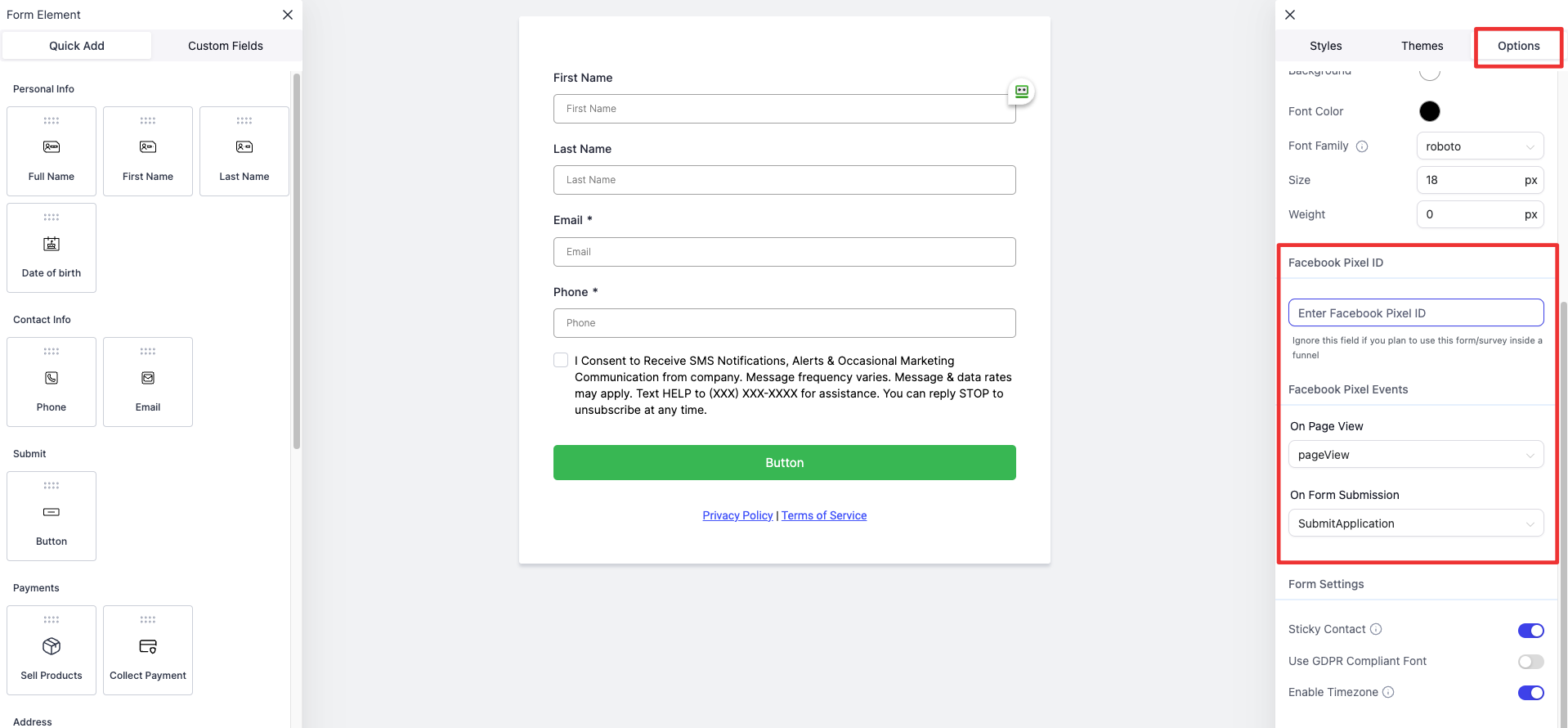 Integration Options: Here, you can also add your Facebook Pixel ID and configure related settings.