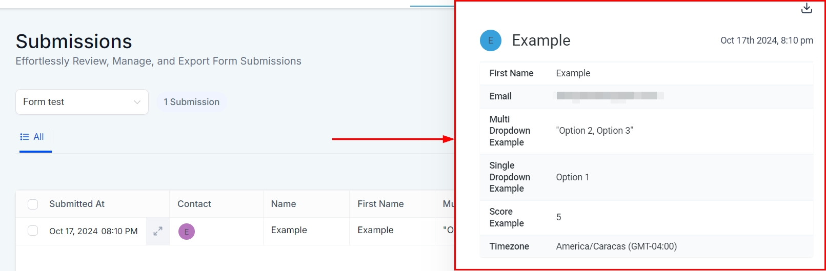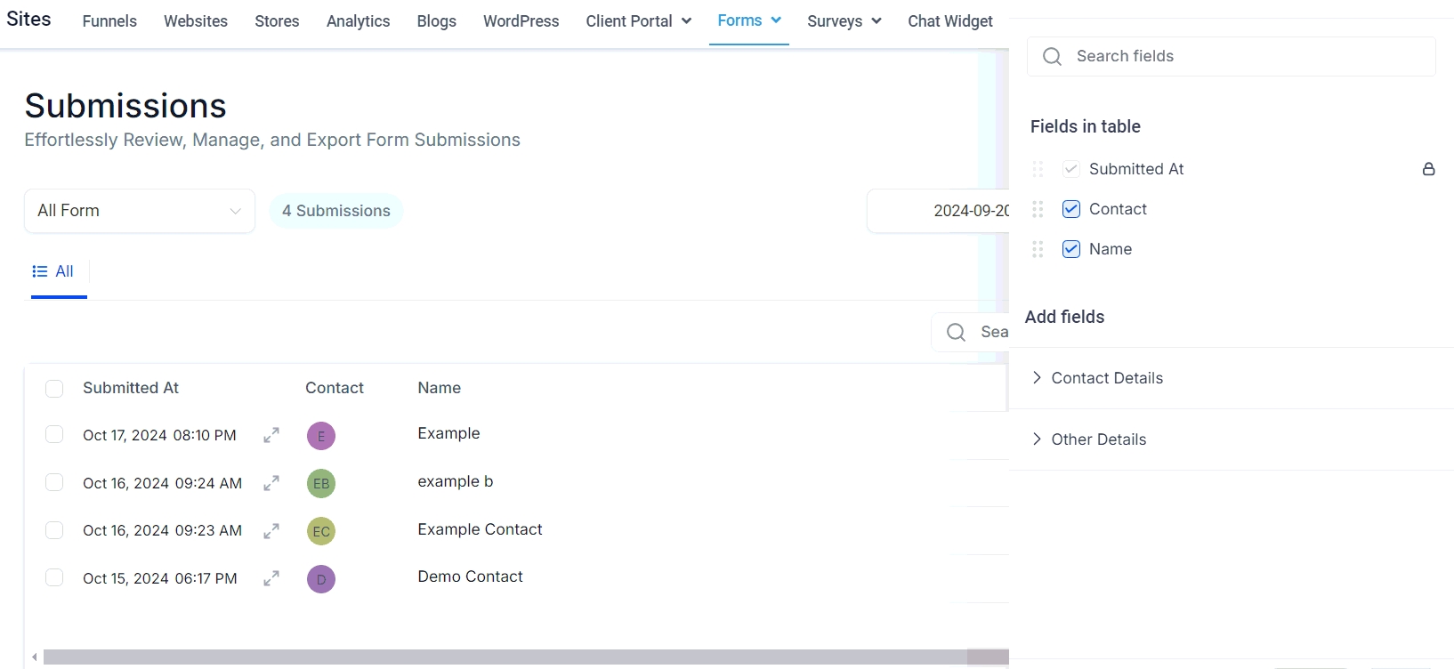 The Form Submission Table displays all submissions for a selected Form, or all Forms if no specific one is selected. Key submission details, such as the respondent's name, email, and submission date, are shown prominently for each entry unless the columns are adjusted.