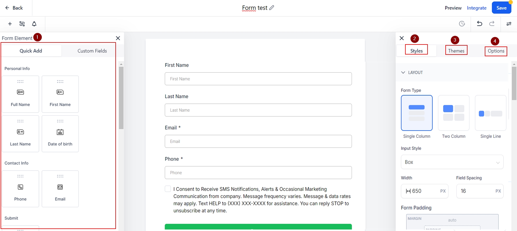 Form Element: The Form Element feature enables adding and customizing fields and components within each form. With the Custom Field option, you can tailor forms to your specific requirements, incorporating specialized fields. The Quick Add option facilitates the inclusion of standard questions, streamlining the form creation process.