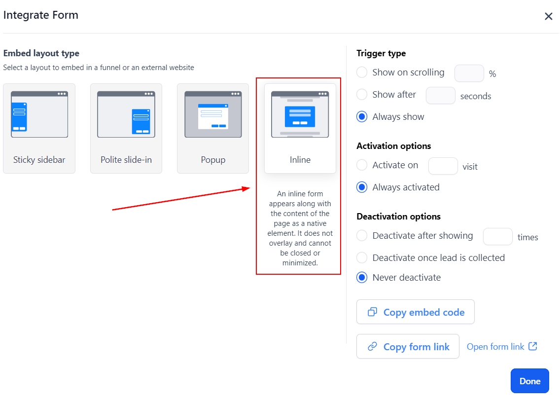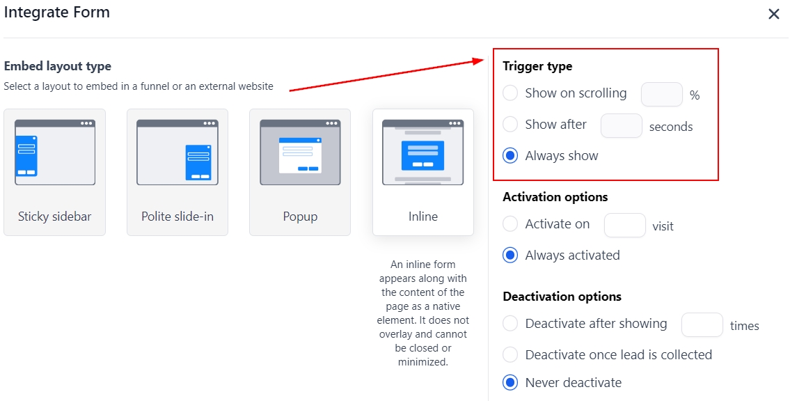With trigger types, the User has the power to control when and how the form is shown on an external page. There are three different ways a user can set the trigger.