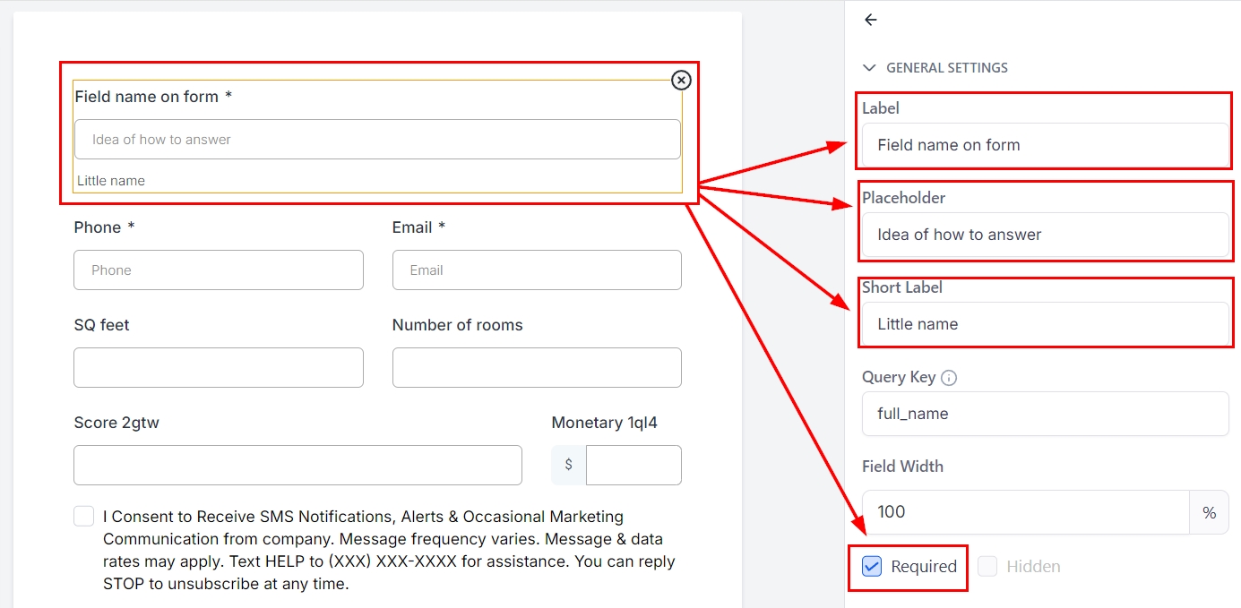 You can personalize the form further by selecting a field, this will open its settings for you to change the field's label, or placeholder, and mark it as required for obligatory information.