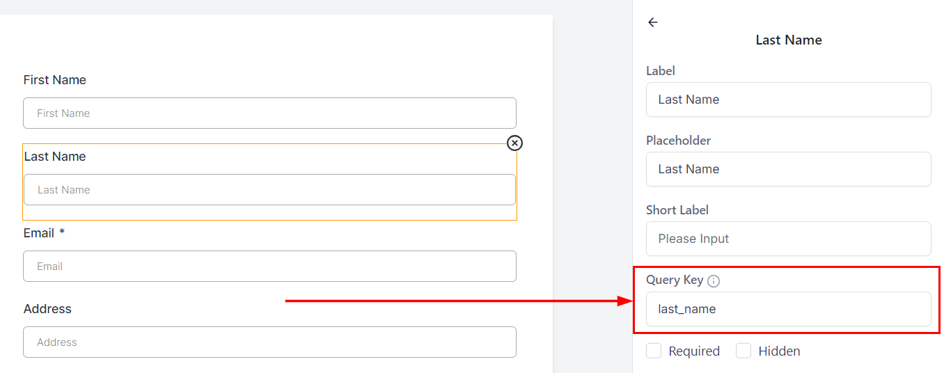 In the form builder, each field that supports URL parameters will have a query key. Note down these keys as they will be used in the URL.