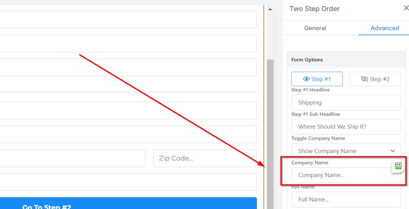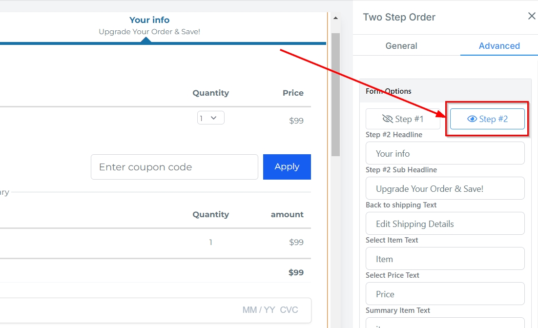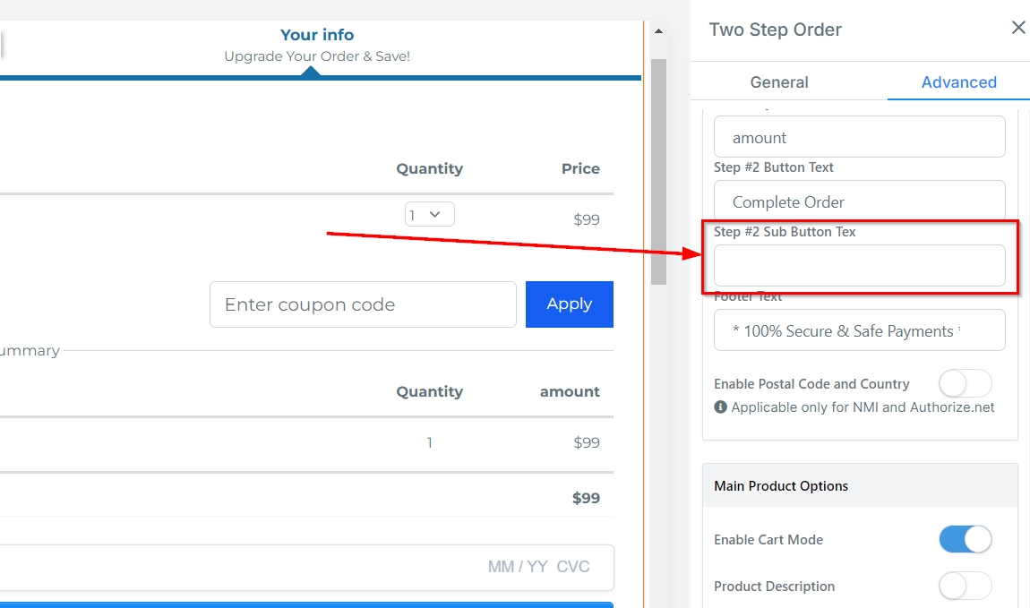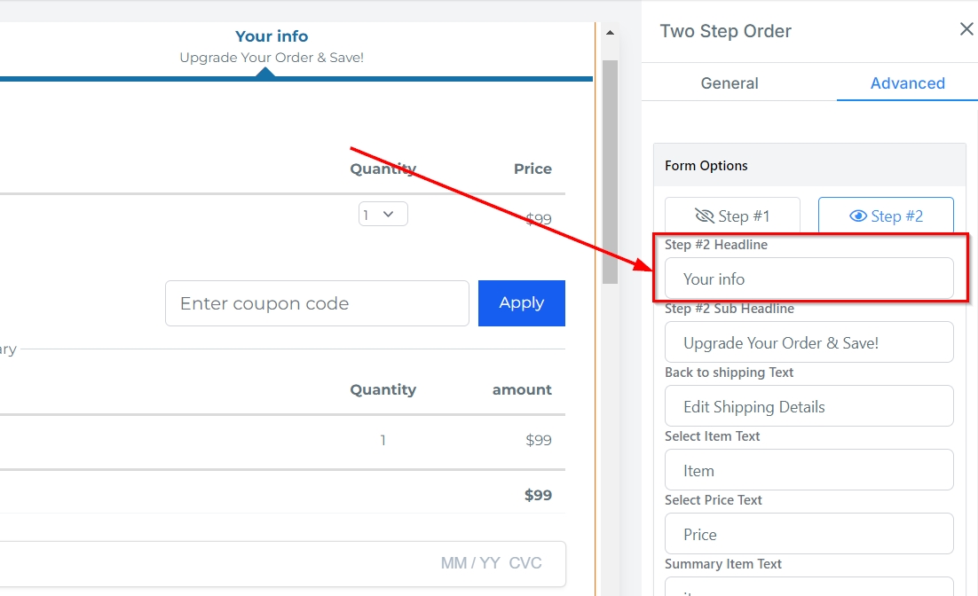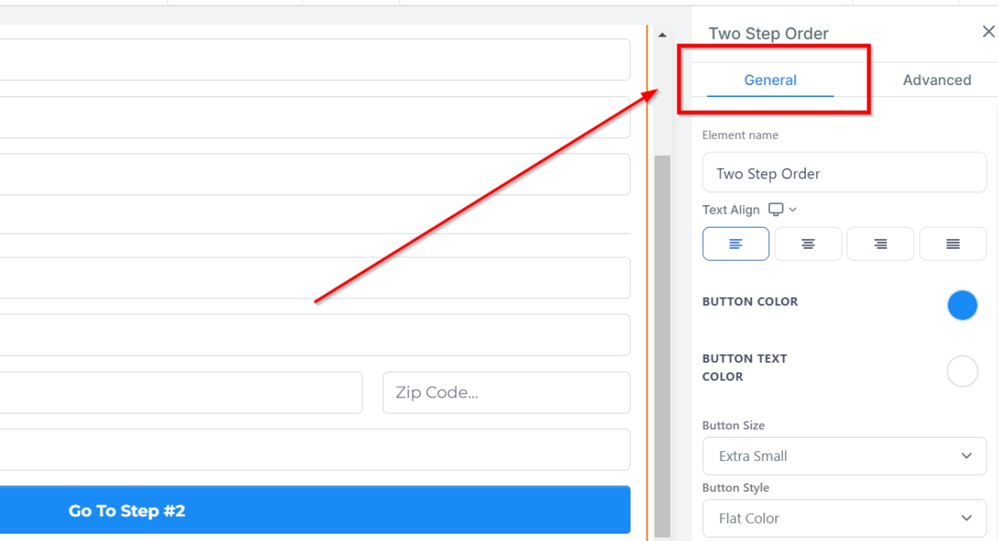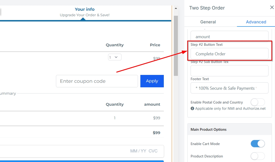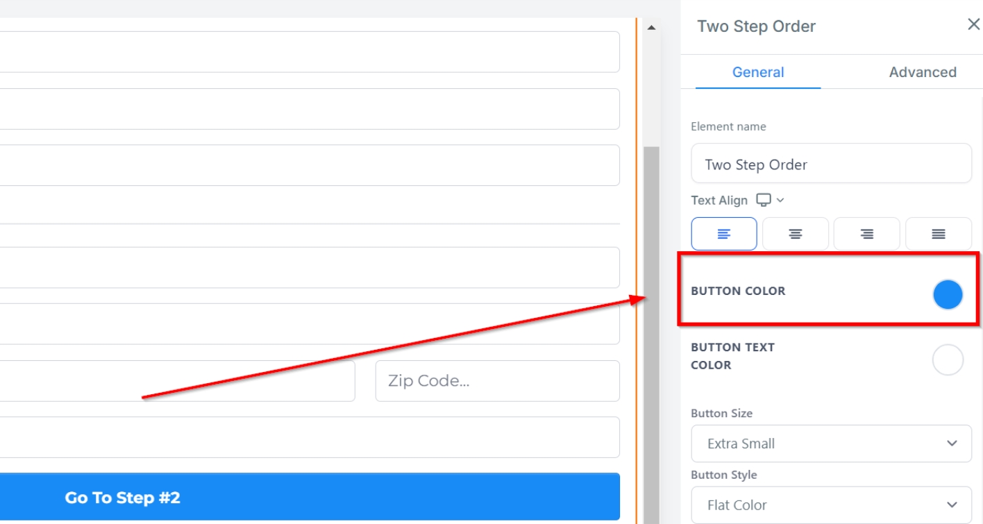 Under Button Text, you can customize the text displayed that allows customers to navigate to step 2 of the order form.