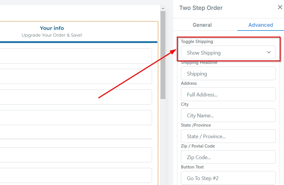You can choose whether to display or hide the form field for Shipping info using the Toggle Shipping feature. If you have shipping info toggled on, you will have options for those fields.