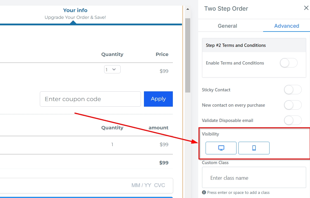 You can decide if you want the order form to be visible on only mobile devices, desktops, or both by clicking on it to highlight the icon.