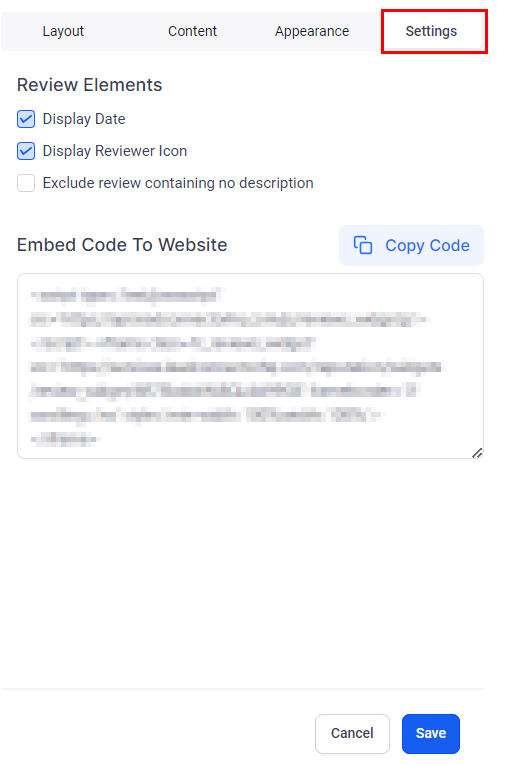 Settings: Here, you can choose to show or hide the review date and icon and exclude reviews lacking a description.