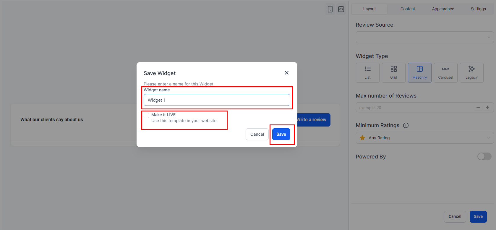 Layout: Choose your preferred widget type, select the review sources (e.g., Google My Business or Facebook), set a maximum review display limit, and decide if you want to show a "Powered by" message.