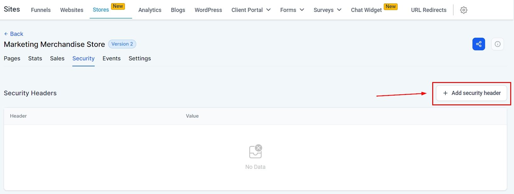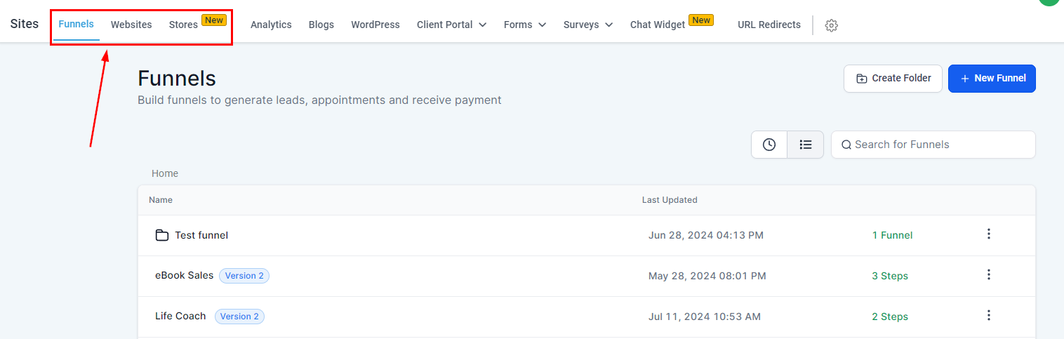 Access your Funnel/Website/Store tab in the Sites section. Here, you can create a new Site or edit an existing one.
