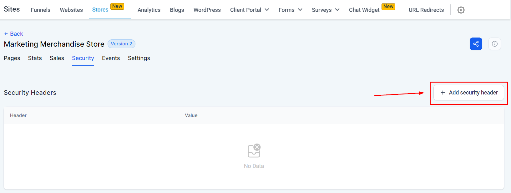 Press the “+Add security header” button to proceed.