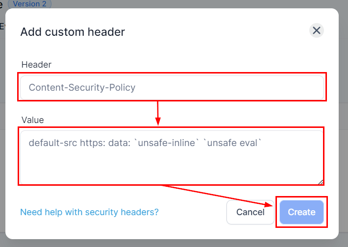 You will be prompted to enter a name and a value for the header. Fill in these details accordingly and click Create.