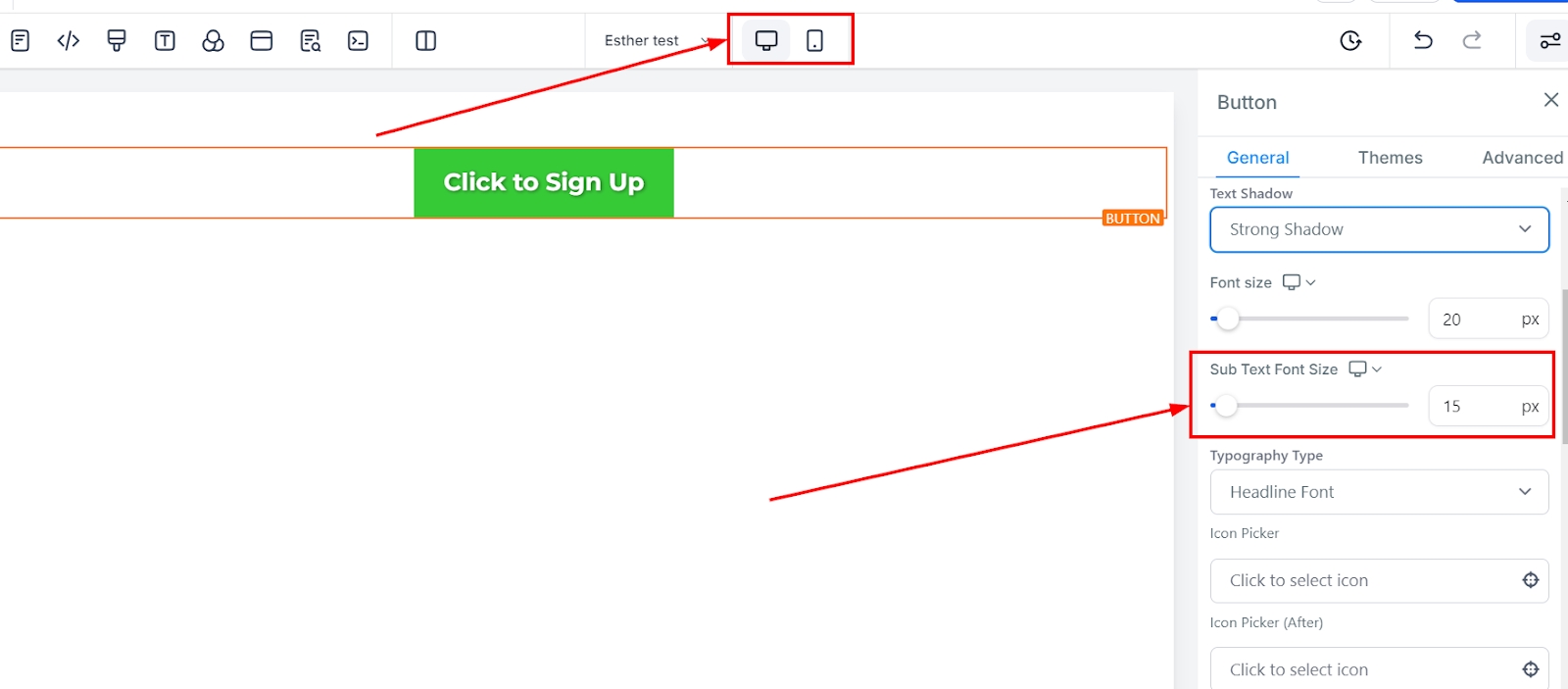 You can adjust the mobile and desktop font sizes of the sub-text/content simply by adjusting the size bars.