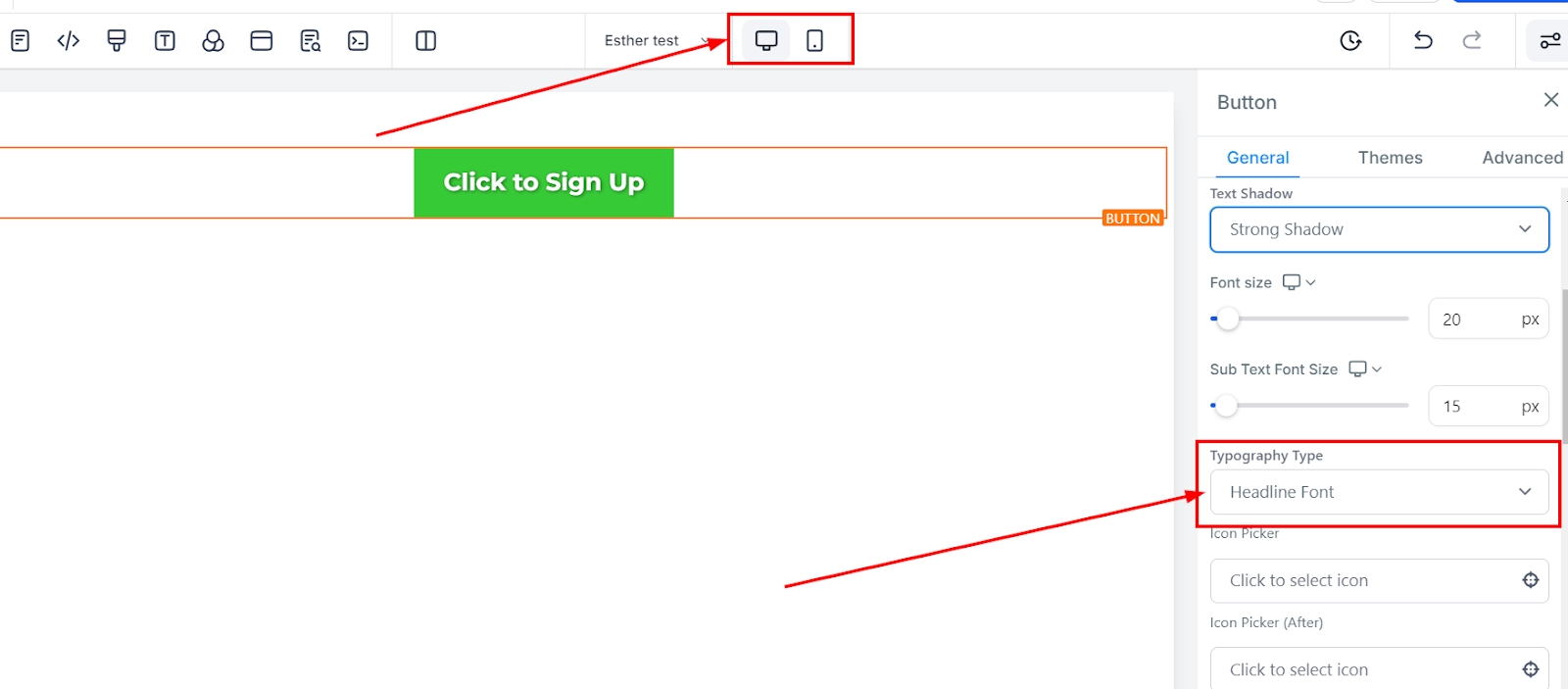 Here you can edit the font of the button text/content. Select the previously chosen button or content font from the settings or choose a new typography font from the drop-down menu.