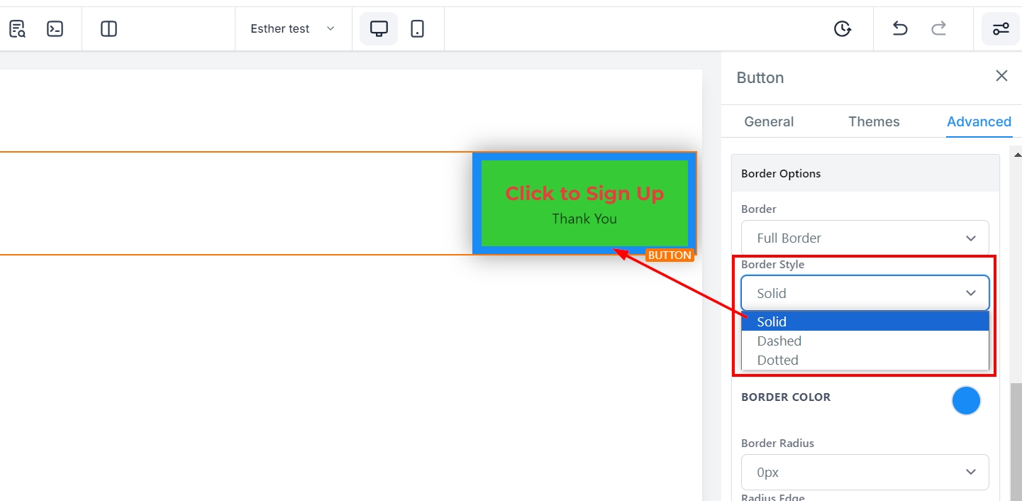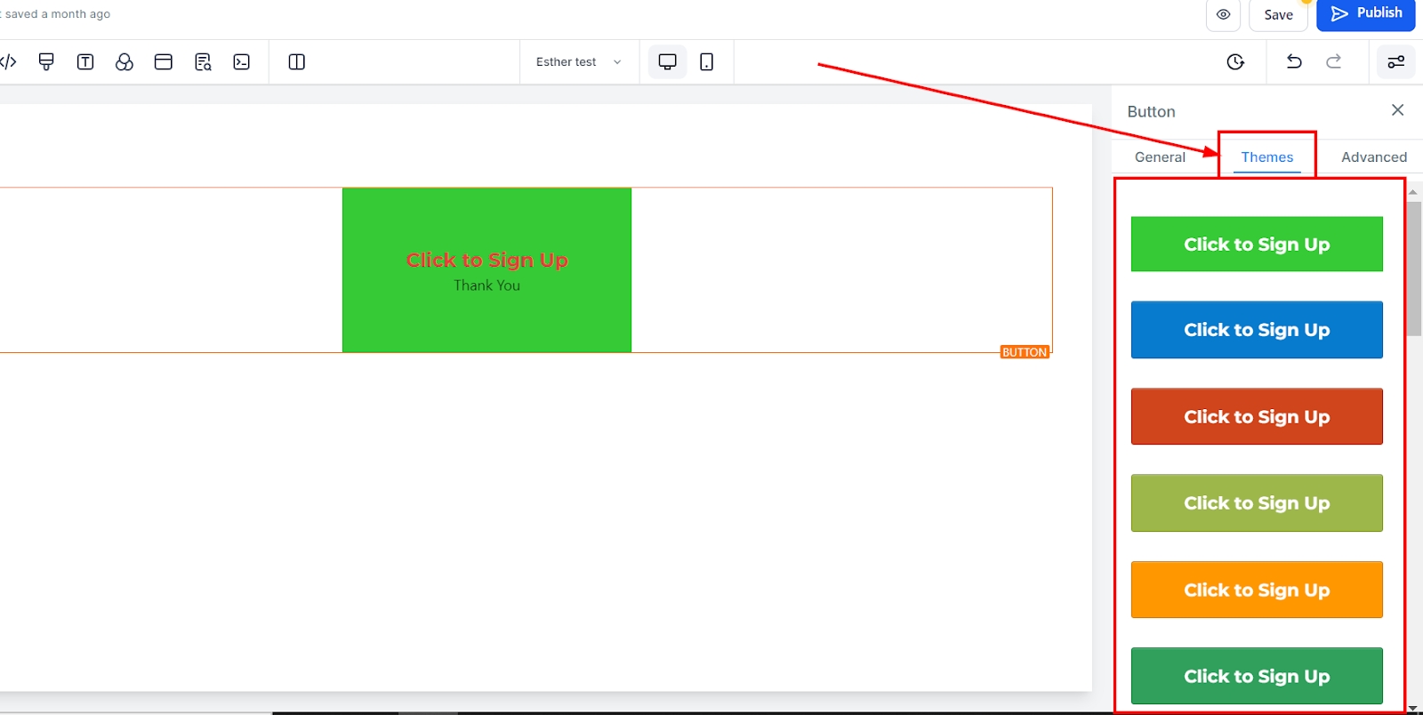 Choose a theme for your button using the button element. Select the available options under the themes tab at the top right. Note that if you choose a theme here, all previous customizations previously made to the button will be removed.