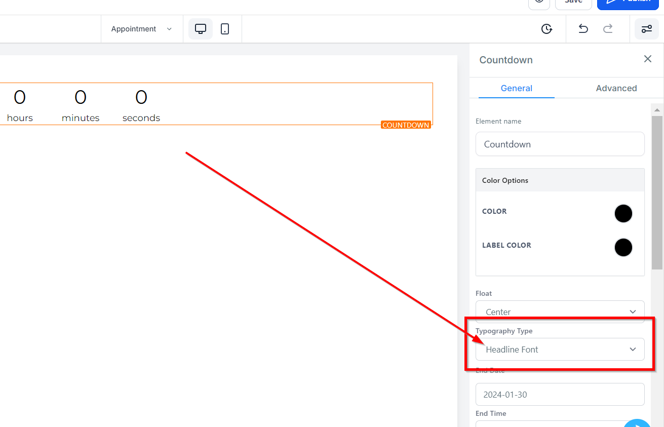 The Typography Type feature allows you to modify the font of your text or content. The convenient drop is available to further customize typography styles. You can select to use the heading or content font you set, or select a different font from the dropdown menu.